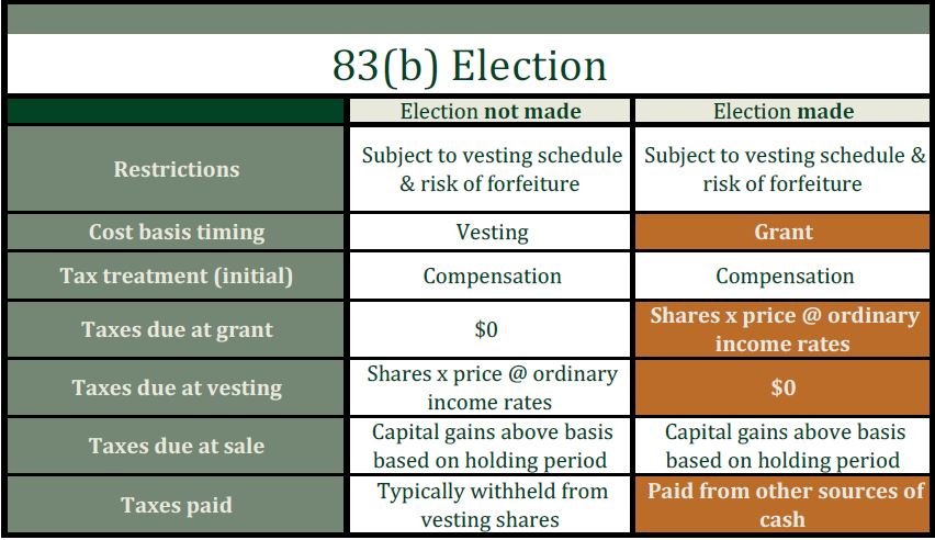 - 83(b) Election: In short, the 83(b) election changes the taxation of the restricted stock. RSUs and restricted stock are generally taxed upon vesting (as explained above), but the 83(b) election allows restricted stock to be taxed upon grant.
