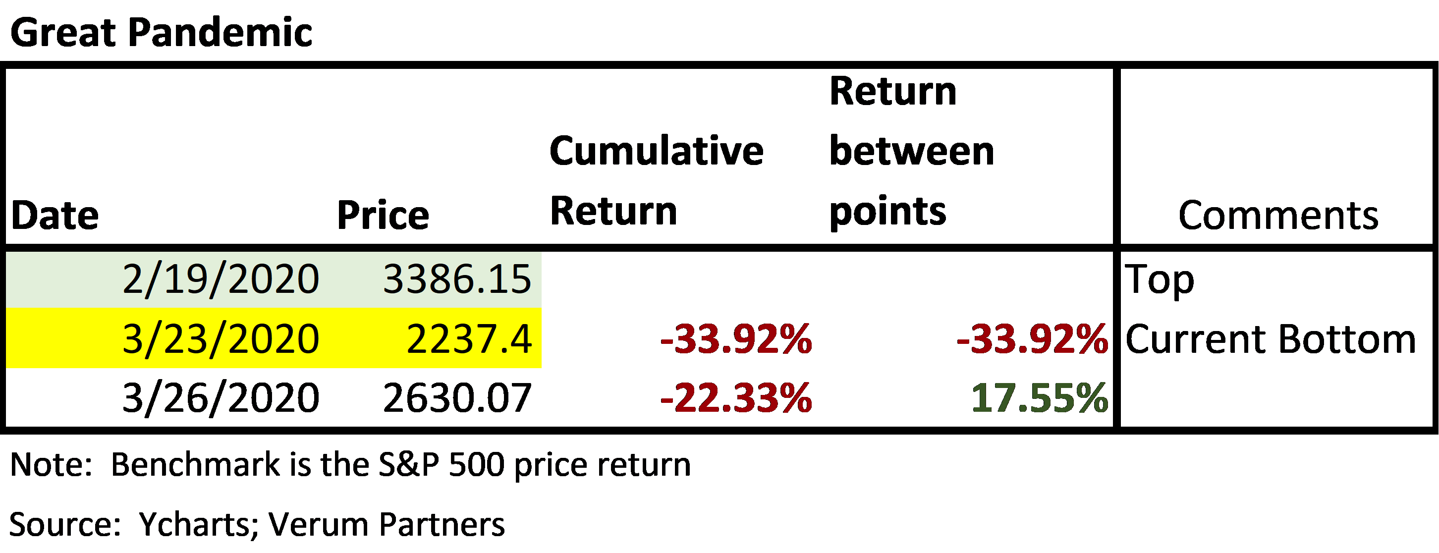 - We ultimately don’t know if we have put in a market bottom. We suspect that we will continue to see historically elevated volatility for the coming weeks and could likely test the recent bottom or make new bottoms as markets come to grips with the economic shutdown.