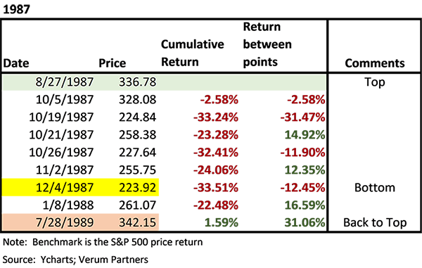 - 1987’s crash offers the most parallels to the Great Pandemic but given 1987’s lack of economic destruction relative to the pandemic, we question whether it’s truly a blueprint.