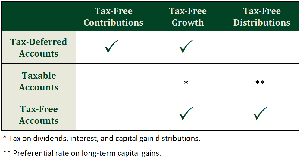 - Tax-free accounts include Roth 401(k)s and Roth IRAs. Contributions do not receive a tax benefit, but the assets grow tax free and enjoy tax-free distributions.