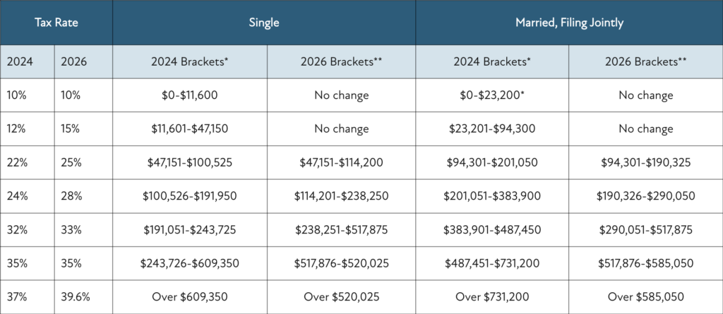 Estate Tax Exemption amounts are the most substantial potential change, although the estate tax in general doesn’t affect many families. Under current tax policy, each individual has $13,990,000 worth of estate tax exemption (a married couple has $27,980,000) before their estate would be subject to the 40% estate tax rate. In 2026, should the TCJA truly sunset, this amount will be cut in half to roughly $7 million per person ($14 million for a married couple). Note: It is only the wealth in excess of these estate exemption amounts that gets taxed at the 40% rate. While this is still a lot of wealth, it certainly introduces uncertainty for another large group of families.
