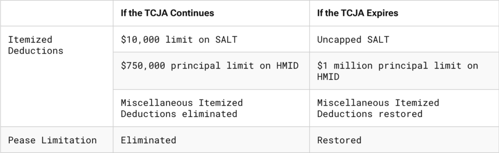 Personal Exemptions were eliminated in the TCJA but will be restored if policy sunsets. These were deductions available at the family level for the taxpayer(s) and their dependents. Child Tax Credits are also expected to be a large negotiation piece. Both personal exemptions and child tax credits are subject to reduction in availability at higher income levels.