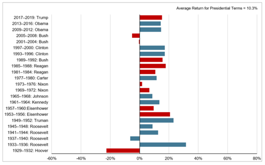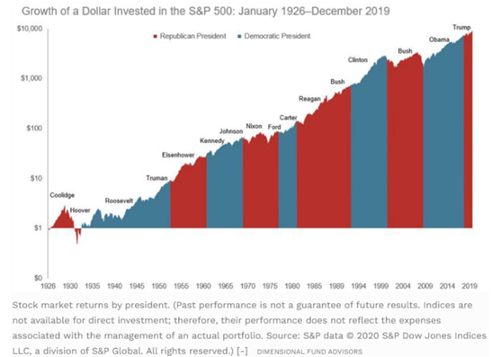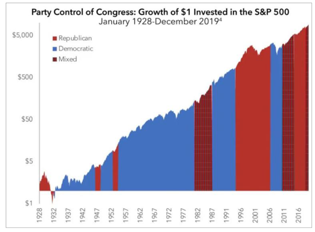 In summary, go vote! Do your patriotic duty and exercise your right to vote. Back whoever you think will be best for the country and your family. But when it comes to your money and your investment strategy, be very careful selling or buying after the election purely based on the results and your excitement or disappointment. History tells us that markets don’t care whether power is controlled by red or blue. Markets care about economic growth and profitability. Those things have happened under most regimes in the United States. Bottom line: stick to your plan and stay invested!