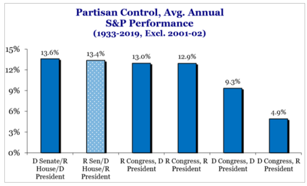 Which party is better for the markets???? They all do fine, but mixed government seems to win by a nose: