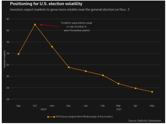 Volatility has been higher recently; is that a concern? Perhaps, but volatility tends to peak around late October and then recede. Assuming we get a clear winner of the election, we expect volatility may fall after the election.