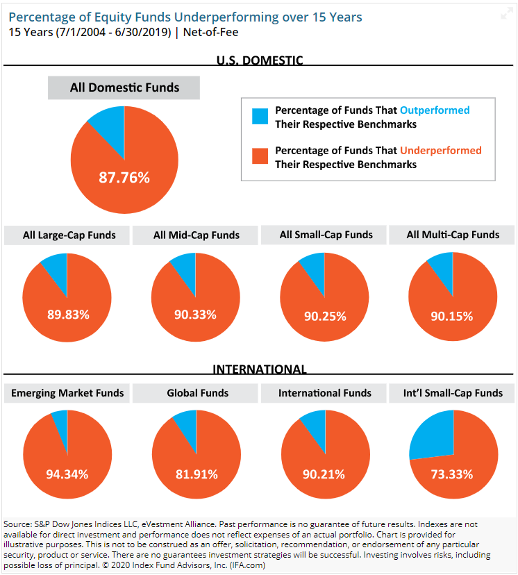 In the investing world, the great debate is whether one should invest in passive vehicles that simply buy the market or should one invest in investment firms with highly skilled players to pick better investments than the market. What the debate misses is that investment professionals are far better at their trade than they were 30 years ago. These investment professionals have far more formalized education, they have access to data that others never had, and they often employ data scientists (also known as quants) and risk managers to help them understand their bets. The industry has gotten better, not worse. So, how have those managers done against the market? The results are nothing short of abysmal. Here’s a table: