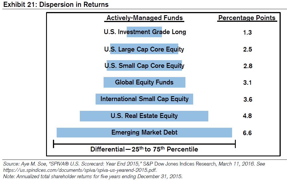 The U.S. stock market is clearly so saturated with active managers that it is nearing supreme efficiency. Yet, the dispersion of results across other asset classes is much broader. The chart below from Mauboussin’s 2017 paper highlights this example (while the chart is dated, current data shows similarly broad dispersion):