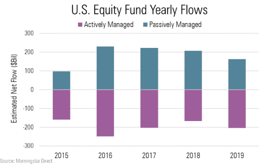 Mauboussin also points out that the massive rise in indexing is likely creating distortions in the marketplace, but he concludes that the average investor should probably have some exposure to indexed equity. These distortions could lead to unintended consequences and could lead to an episode of poor performance. The risk with an index-only approach is that a tail event (sometimes called a black swan event) could lead to poor enough results that many investors sell their stocks and abandon the strategy at the wrong time. We have no good way of quantifying the risk of a market distortion. Given recent events with certain IPOs, we suspect that active management is very much alive and well and that price discovery is still healthy. The chart below highlights fund flows into active and passive funds: